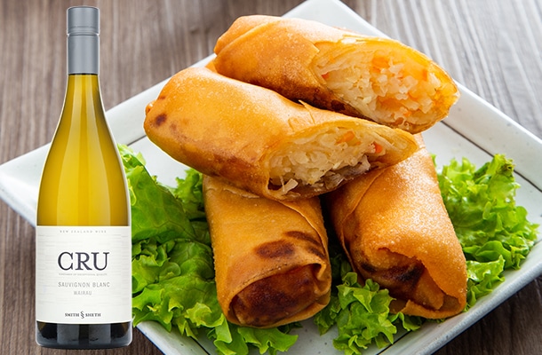 春巻きは春の象徴的な食べ物とされ、春節の時期に食べると縁起が良いと言われています。前出のロゼ・スパークもぴったりですが、野菜が多めで海鮮(エビやイカ)が入った春巻きには軽やかな白ワインもおすすめです。ここでは、ニュージーランド/マールボロのソーヴィニヨン・ブランを一押し!シトラスやフローラルなパッションフルーツの香りがひろがり、シャープな酸味が油をすっきりと流し、柑橘やハーブのような香りが餡の繊細な旨みを引き立ててくれます。