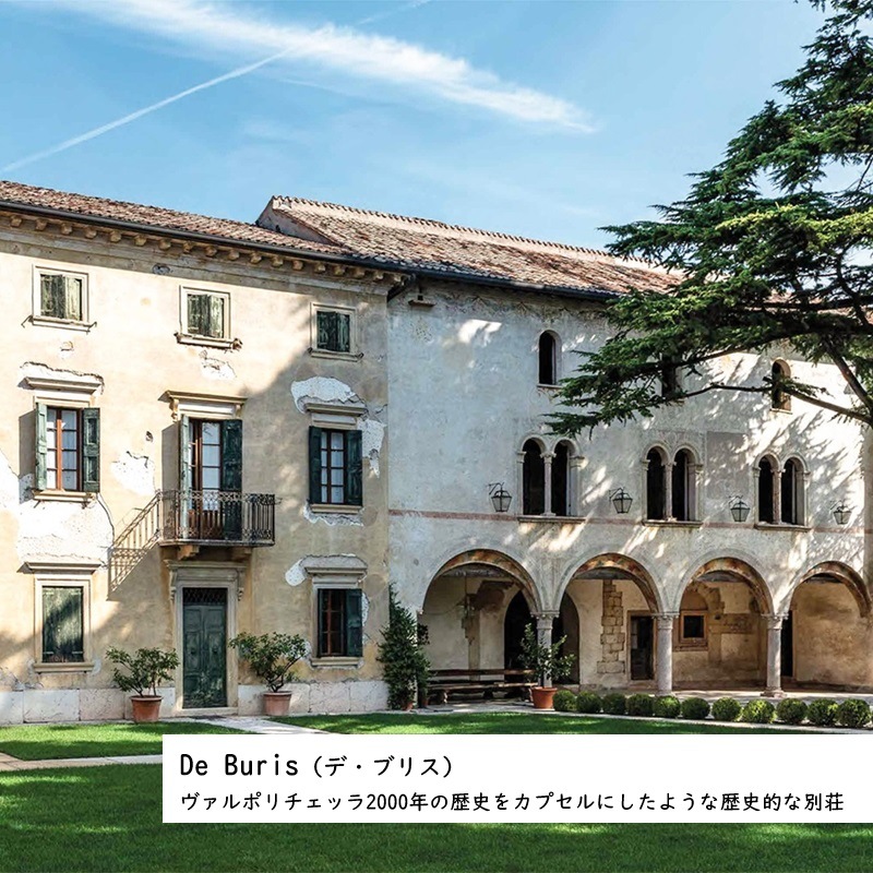 1902年の創業以来トンマージ・ファミリーは、ヴァルポリッチェッラ・クラッシコの中心地で、地元に深く根差しワイン造りを行ってきました。現在4代目で、ワインは全て242haの自社畑から造られます。「デ・ブリス」は、ヴァルポリチェッラの2000年の歴史をカプセルにしたような歴史的な別荘の名前で、醸造から熟成までデ・ブリスの建物で行われています。名高いラ・グロレッタの畑の一番高所にあるデ・ブリス専用の区画のブドウから造られます。樽熟5年、瓶熟6年以上と熟成期間が長く、トンマージとヴァルポリチェッラの伝統を表現したラグジュアリーワインです。